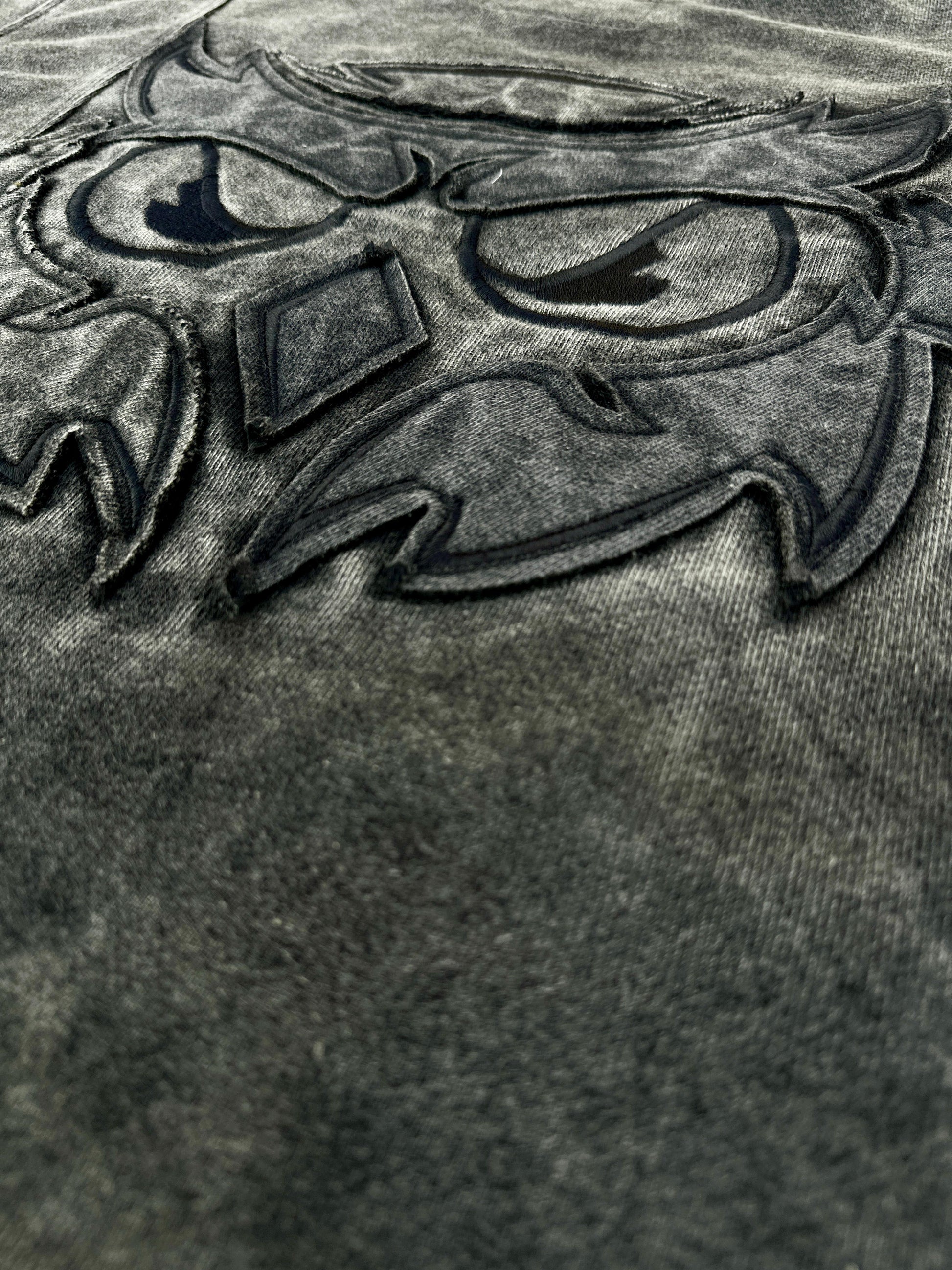 • Stone Wash Finish: Custom acid wash on the sleeves and side panels for a rugged, vintage texture.