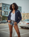This is a stylish acid-washed dark denim jacket that embodies a bold and visionary aesthetic. The front features an embroidered message: “WRITE the VISION And Make it Plain,” adding a touch of inspiration and purpose. The back showcases an oversized distressed owl embroidery, representing wisdom and vision, aligned with the Visions Collection brand. The jacket also has a branded patch near the bottom hem that reads “VISIONS” in orange, giving it a unique, high-quality finish. With its distressed detailing and comfortable fit, this jacket makes a statement while offering timeless versatility.