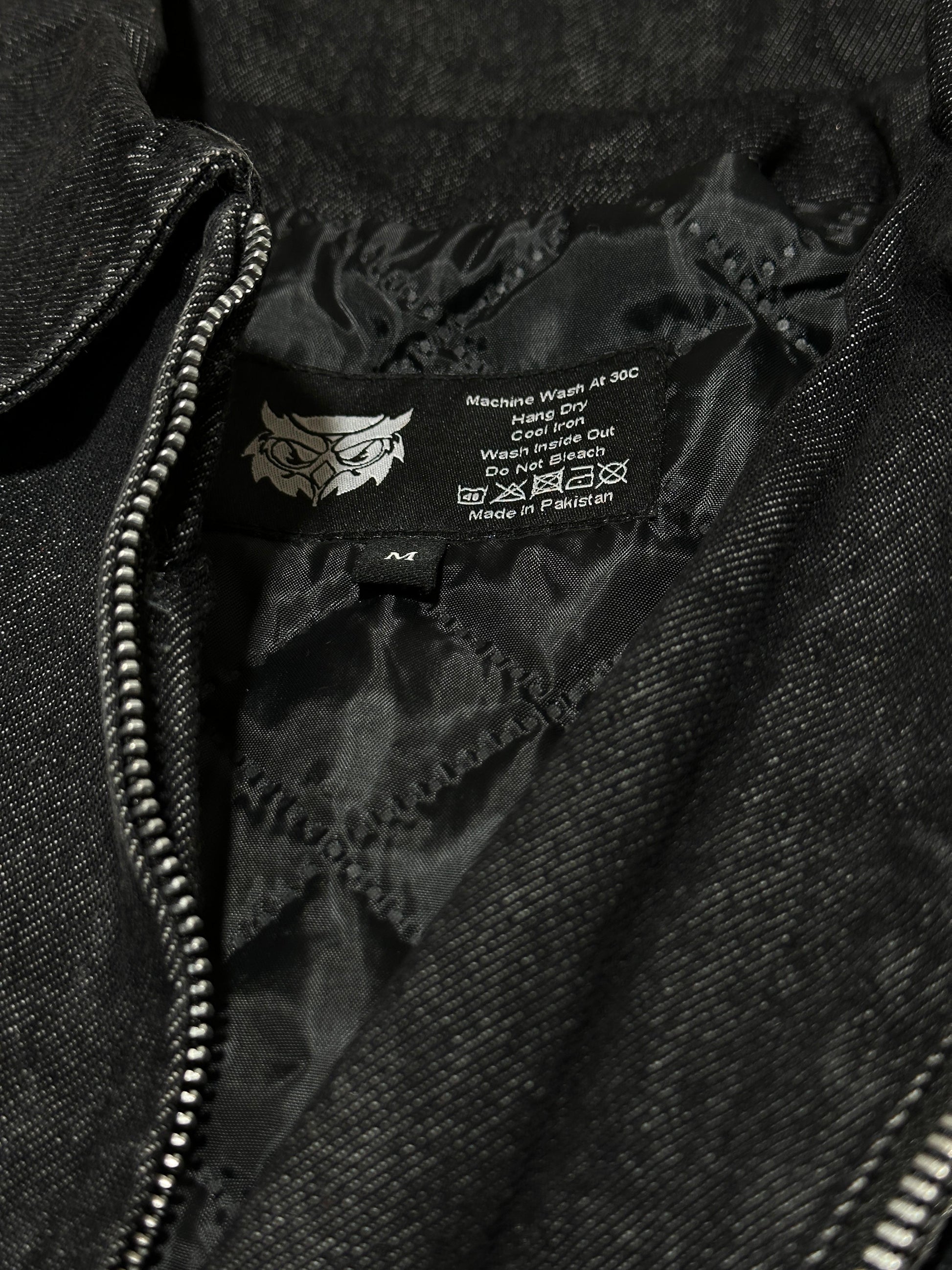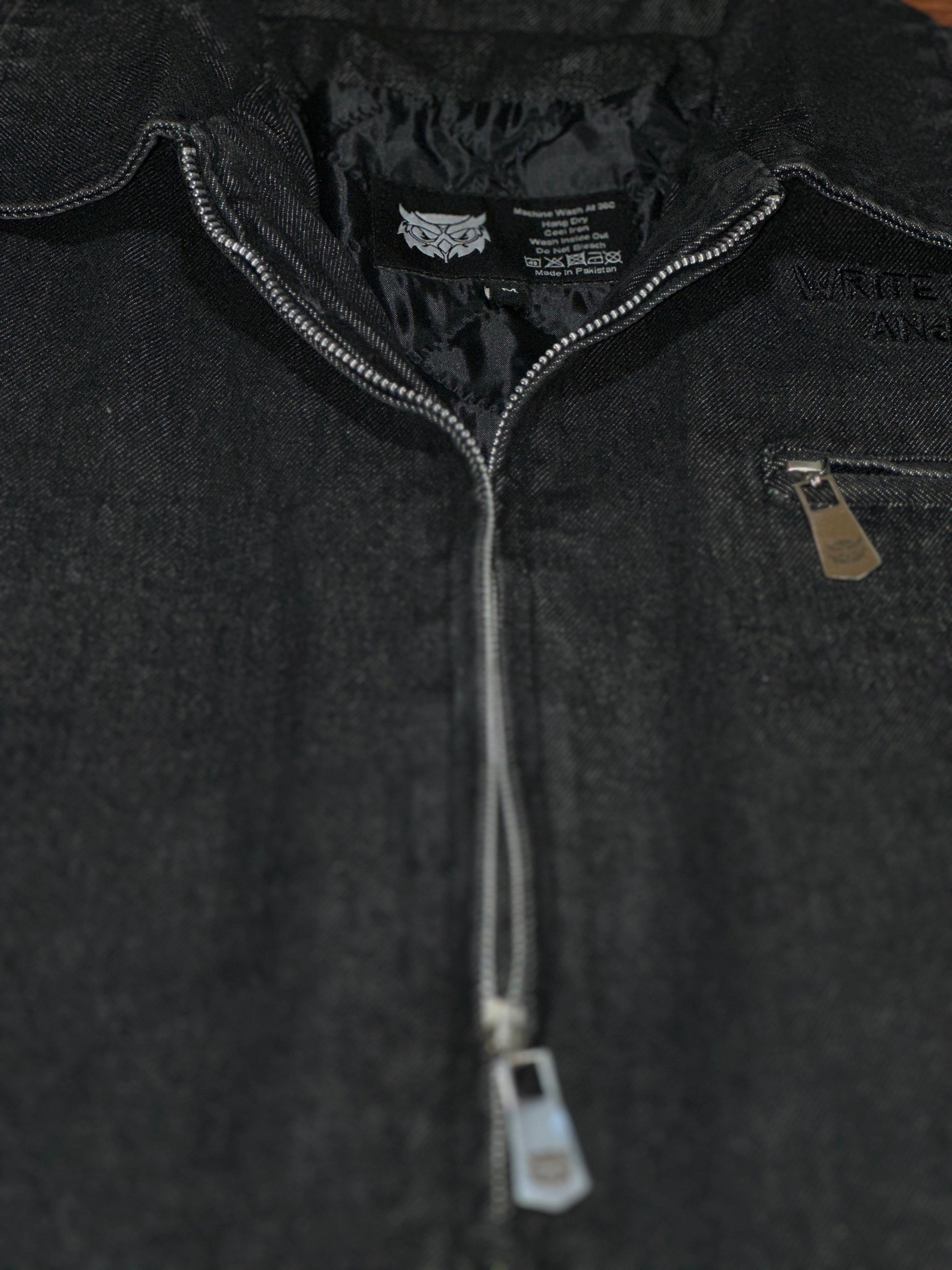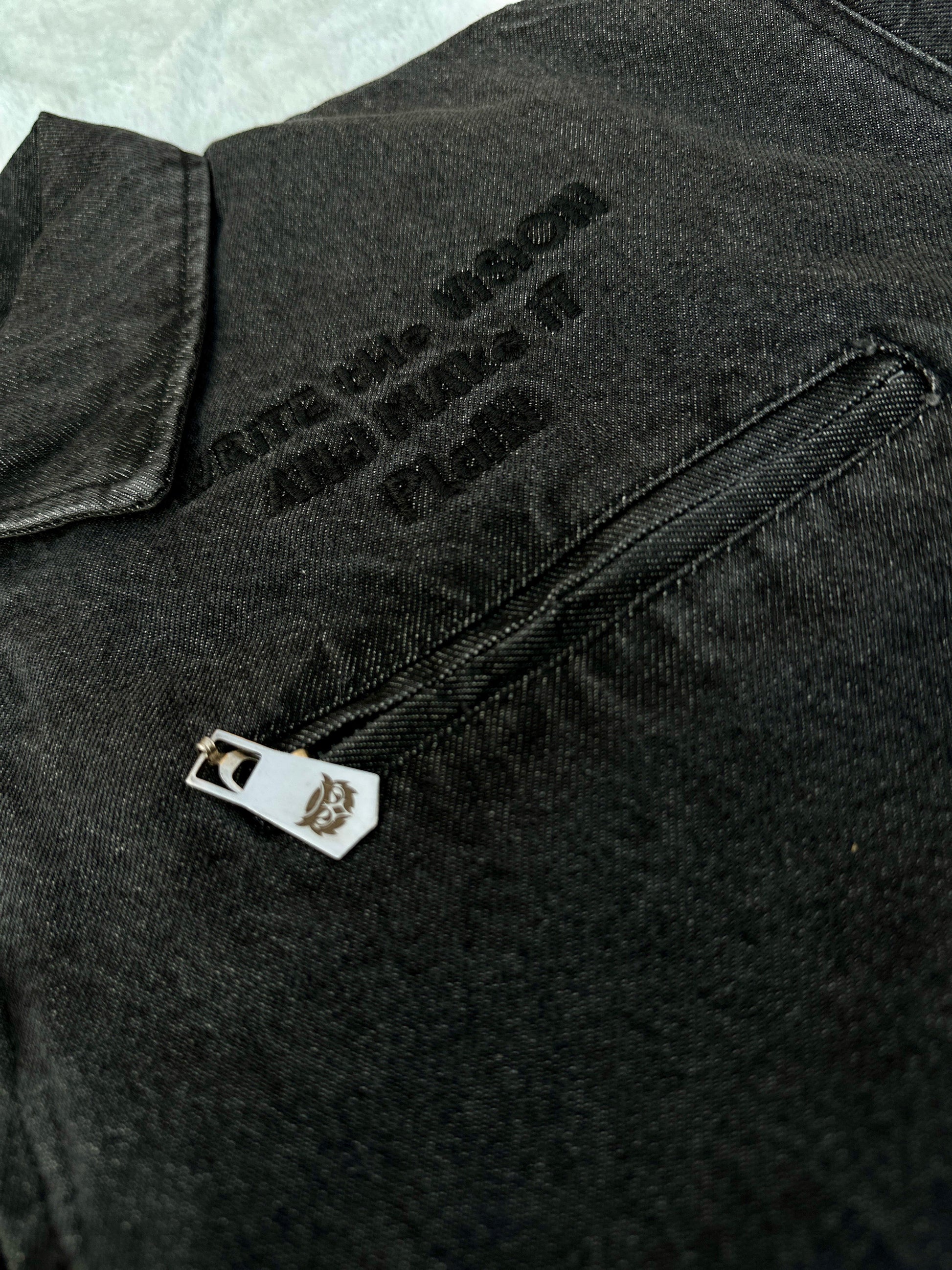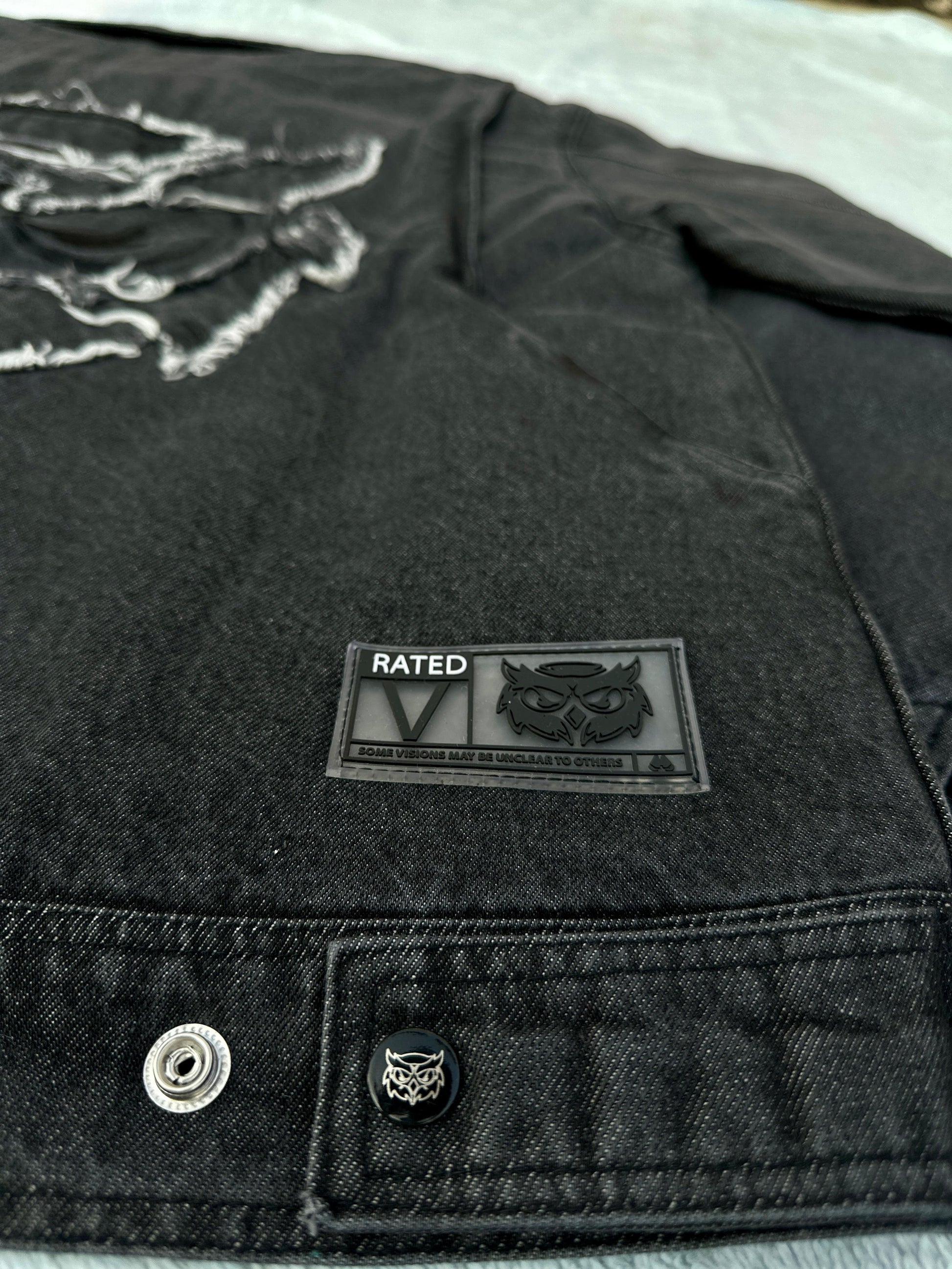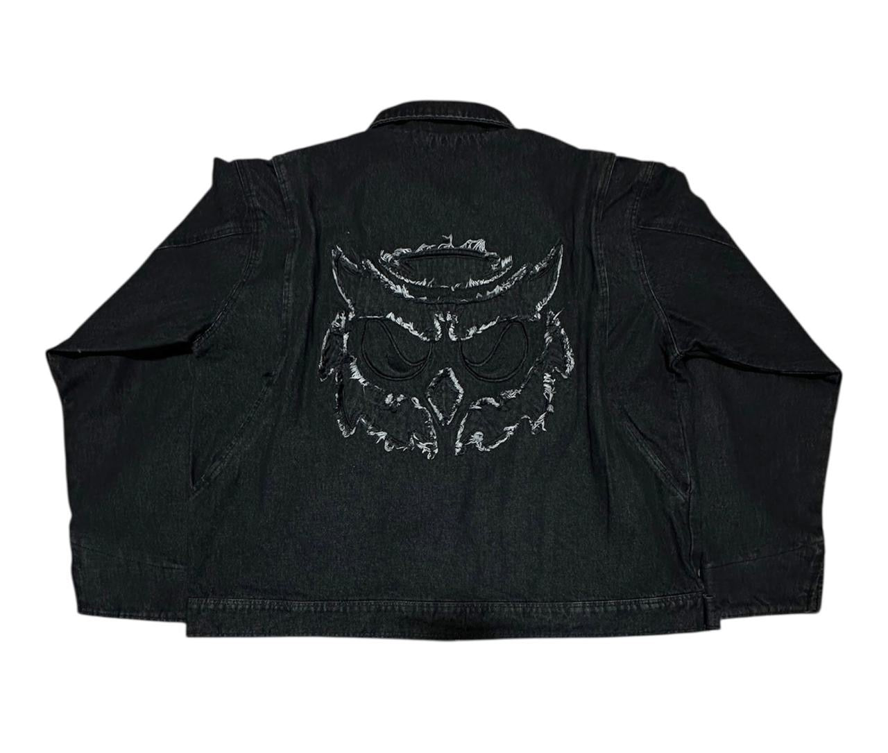 This is a stylish acid-washed black denim jacket that embodies a bold and visionary aesthetic. The front features an embroidered message: “WRITE the VISION And Make it Plain,” adding a touch of inspiration and purpose. The back showcases an oversized distressed owl embroidery, representing wisdom and vision, aligned with the Visions Collection brand. With its distressed detailing and comfortable fit, this jacket makes a statement while offering timeless versatility.